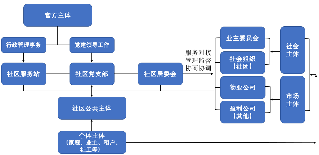 我国社区公共主体主要指社区党支部、社区服务站、社区居委会、其他社会主体和市场主体等,即“党—站—居—社”的“四位一体”格局。这意味着必须从原有的狭隘的公共主体格局中走出,把社会主体和市场主体也作为公共主体,因为它们在社区的层面上同样处理的是公共事务,同样享有一定的权利并承担一定的义务。业主委员会、各种社团组织等社会主体是最为典型的社区型城市权利的公共主体,或者主要是权利主体,其所承担的义务也需要对照权利进行理解。物业公司、其他盈利性公司等市场主体成为社区型城市权利的公共主体则主要基于合同的权利义务规定,因此市场主体也可以成为社区型城市权利的义务性主体。一般认为,社区党委会、社区服务站及其他基层党政组织则是社区型城市权利的义务性主体。社区居委会作为基层群众性自治组织,则既可以是权利主体,也可以是义务主体,主要得看其承担具体职责的性质如何。